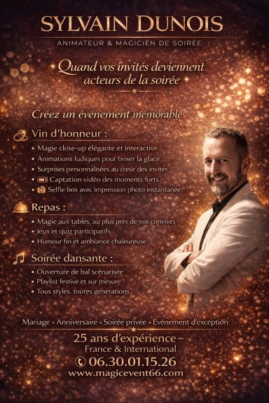 Plongez dans l’univers féerique de Sylvain, magicien professionnel et mentaliste, et animateur de soirée polyvalent à travers une sélection de photos et d’affiches officielles.